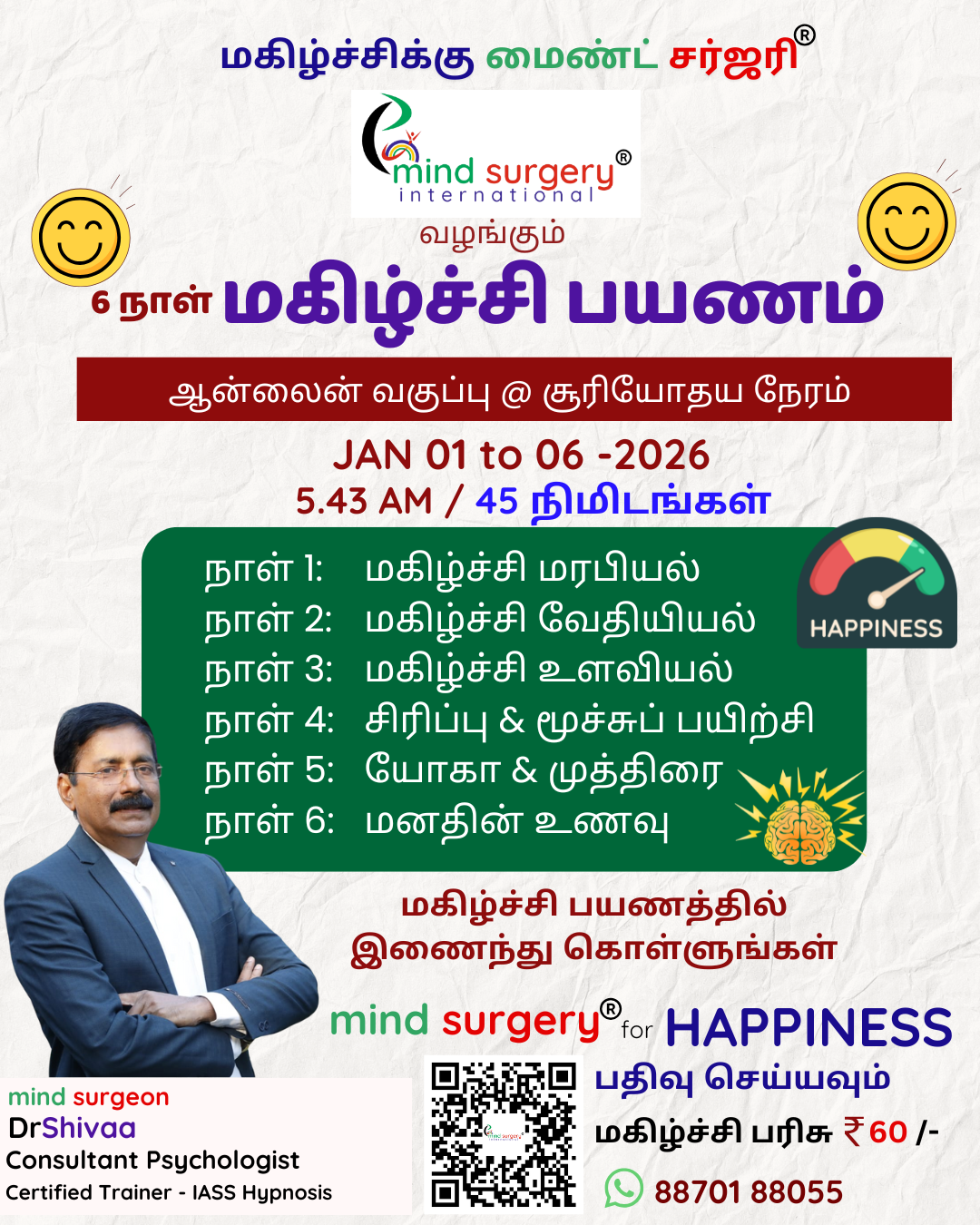 As a Tamil Medicine Protocol - mind surgery ® is structured for self - mind therapy, management and training. Travel with a trained mind to connect with microcosm ( பிண்டம் ) and macrocosm ( அண்டம் ). It is a psychotherapy protocol which anchors well as " Placebo " surgery. Delivers on basis ' Eco Laws": Ecologia ( Family ) & Economia ( Finance ) which forms 2 side of the coin, viz life. The mind surgery ® focuses on Happiness, the gateway for the balance of Family and Finance with the platform of Health. Mind Surgery is a trade marked concept of mind management based on traditional tamil medicine. Mind Surgery is a psycho therapeutical protocol to dehypnotize negative beliefs and rehypnotize positive beliefs at alpha mind state. Mind Surgery is a mind cleansing, neutralizing, energising protocol for family, finance and fitness to accornplish with ease. In Tamil "Mind Surgery Kriyai" ( MSK ) is termed as " Manam Suddhi Kriyai " - மனம் சுத்தி கிரியை, mind purification hypnotic protocol akin to " Naadi Suddhi " - நாடி சுத்தி. 'Dhasa nadi' impulses of Siddhar Thirumoolar and legacy of Siddhar Karuvur Thevar - the Raja Guru of Raja Raja Cholan form the fulcrum of this mind surgery ® protocol